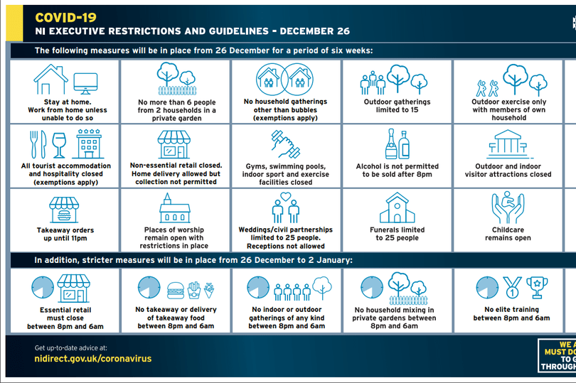 Following an increase in coronavirus (COVID-19) cases, additional restrictions were introduced for people in Northern Ireland on 26 December 2020. These new restrictions are in place to help reduce the spread of coronavirus and to help manage the pressures on our health and social care system. During this time, the single most important action we can all take is to stay at home.